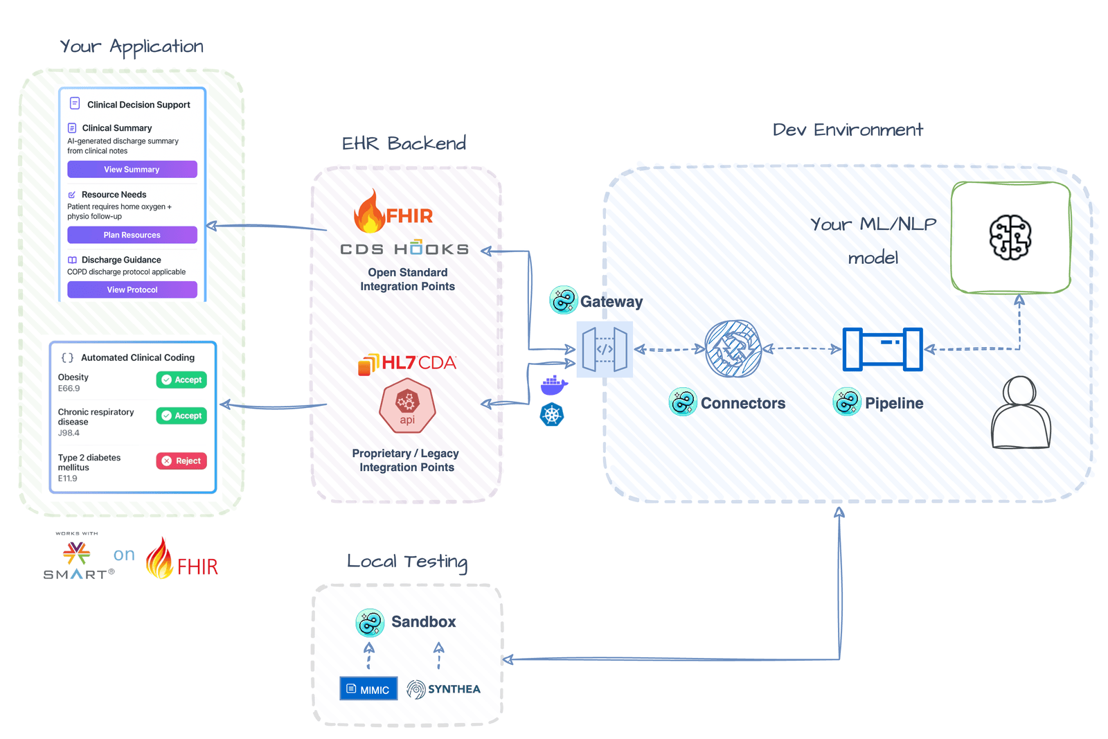 HealthChain provides a sandbox client utility which simulates the CDS hooks workflow end-to-end. It loads your sample free text data and formats it into CDS requests, sends it to your service, and saves the request/response exchange in an output/ directory. This lets you test the complete integration locally and inspect the inputs and outputs before connecting to a real EHR instance.